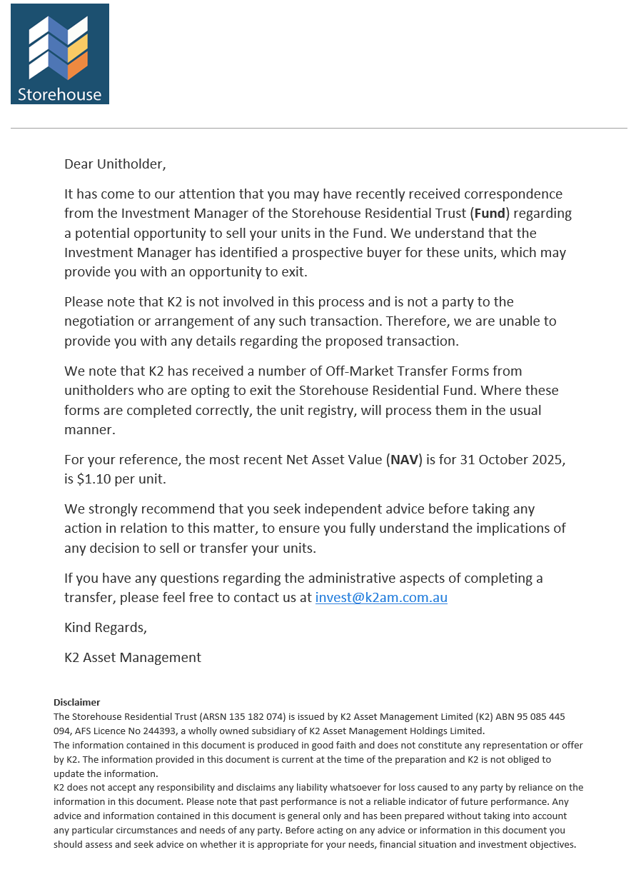Please see investor information below Offer DocumentsFormsFact Sheets and AnnouncementsAnnual Reports Storehouse Unitholder Correspondence - December 2025 Storehouse Residential Trust AMIT statements Storehouse Residential Trust Financial Report - 30 June 2024
